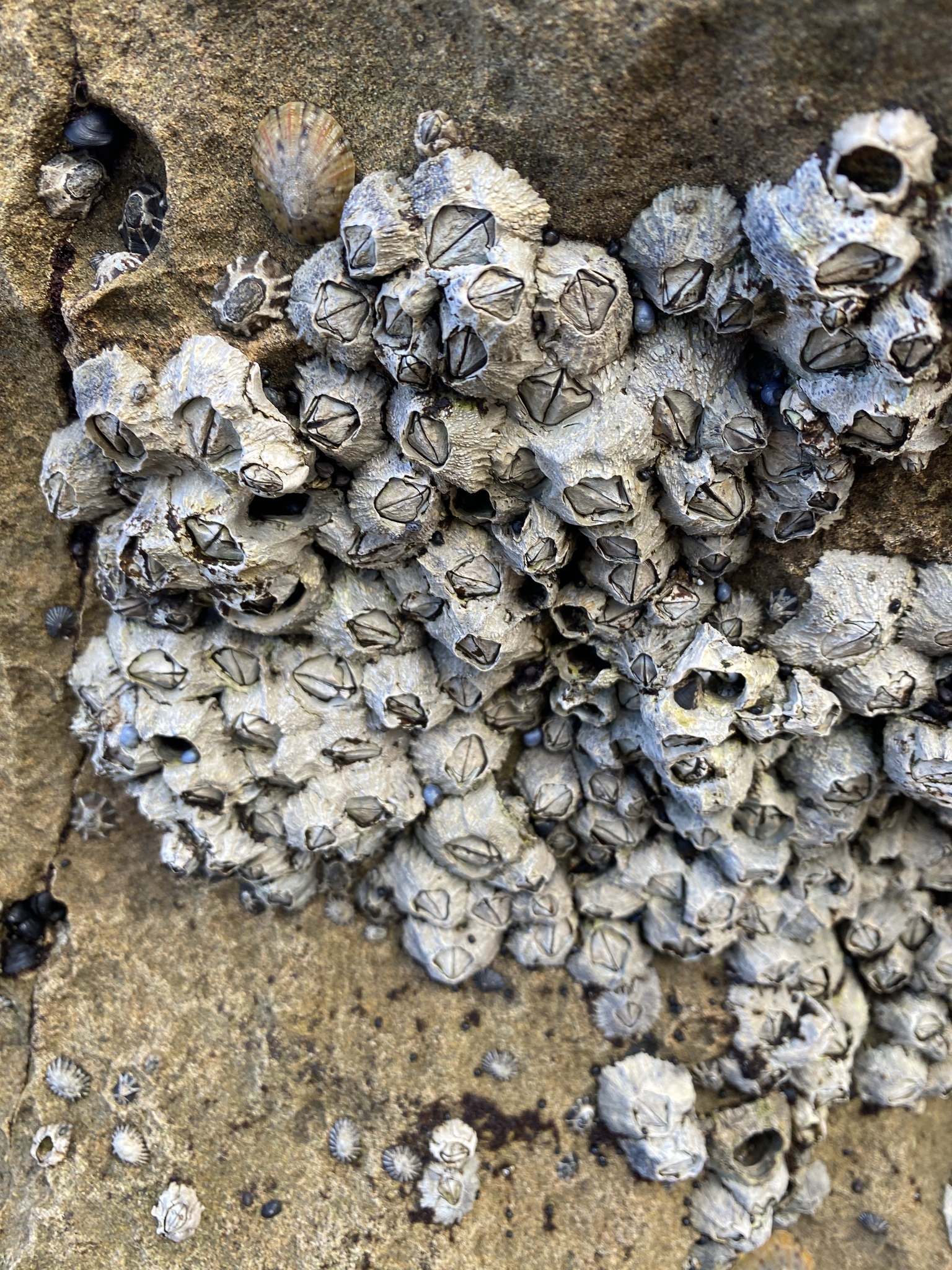 Barnacles are not related to the other seashells in this guide, but I couldn't include a guide to Keats seashells without mentioning them. While the rest of the species in this guide are mollusks (related to snails, slugs, octopi, etc), barnacles are actually crustaceans, more closely related to crabs than they are to mussels and clams. The most ubiquitous barnacle on Keats Island is the Pacific Acorn Barnacle, which forms a ring on the rocky bluffs just above the blue mussels. This contributes to the stripey look of our coast from a distance: first bare grey rock above the high tide line, then a white ring of barnacles at the high tide line, followed by the deep blue ring of mussels below. These small white shells will be familiar to any beachgoer who frequents the rocky shores, and can be painful to bare-footed beachgoers!
